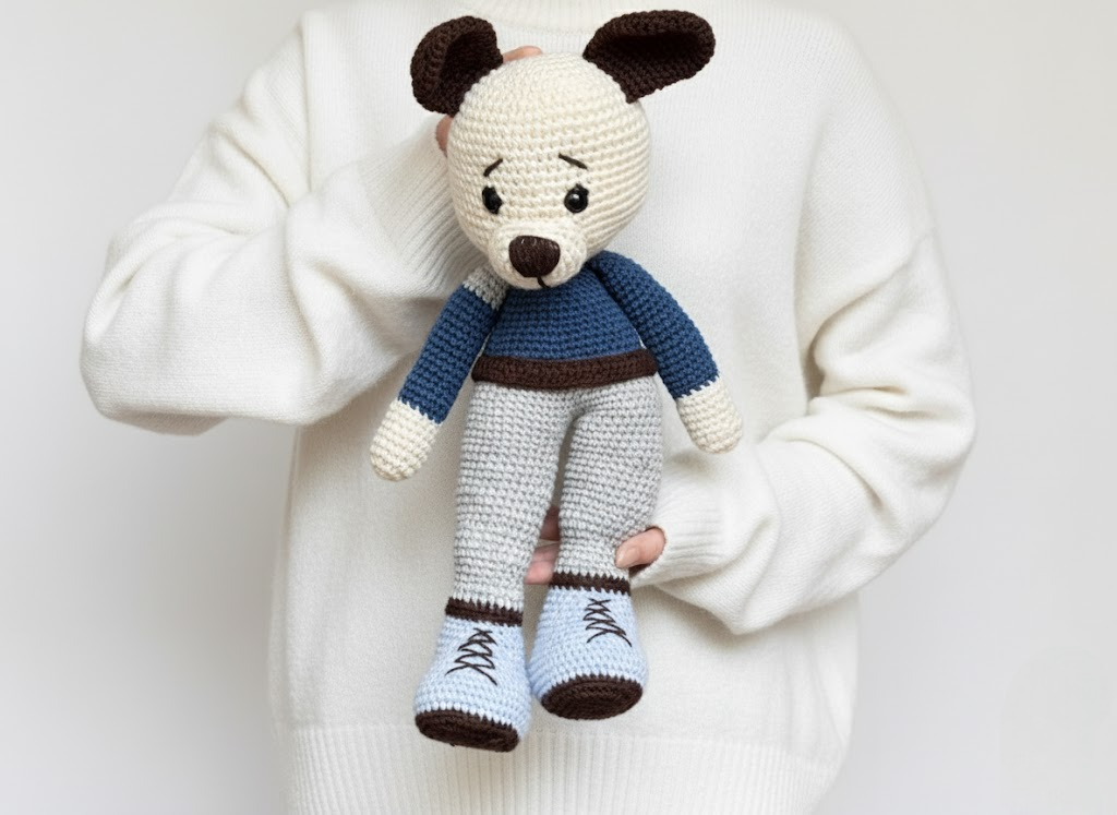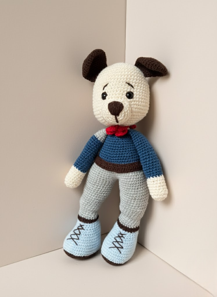 Ce grand chien au crochet a une allure adorable avec ses longues jambes, son petit museau chocolat et son regard attendrissant. Il porte un ensemble bleu et gris ainsi qu’un petit nœud rouge qui ajoute une touche charmante. Sa taille généreuse en fait un compagnon parfait à exposer dans une chambre ou à câliner. Entièrement réalisé à la main.