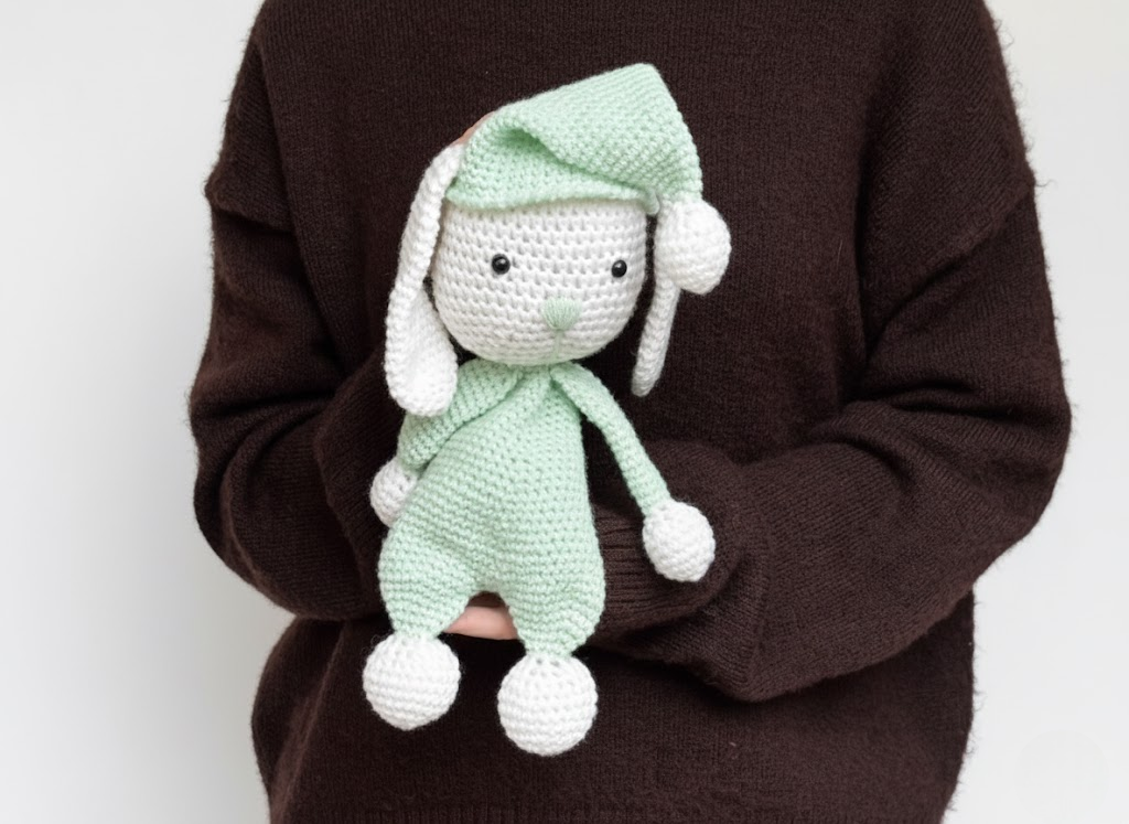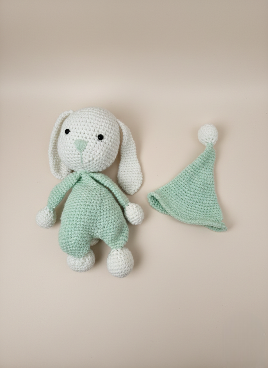Ce grand lapin au look apaisant porte une grenouillère vert menthe et un long bonnet assorti, terminé par un pompon. Ses oreilles tombantes et ses pattes rondes lui donnent une allure tendre et rassurante. Le bonnet n’est pas fixé : il peut être retiré ou remis, ce qui ajoute une petite touche de jeu et de personnalisation. Un compagnon idéal pour accompagner l’heure du coucher ou décorer une chambre avec douceur.