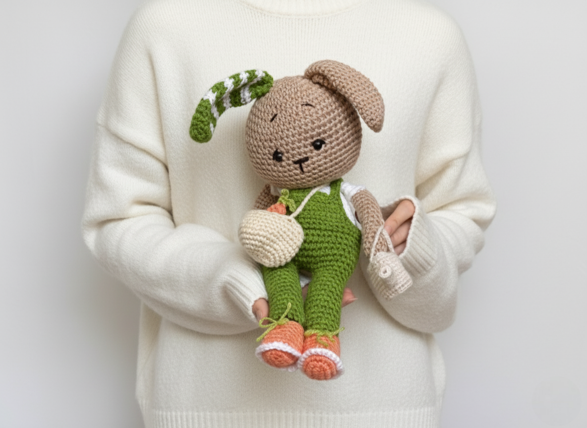 Cette lapine a été crochetée avec soin et porte une salopette verte qui lui donne un vrai air de petite jardinière. Dans son sac, elle emporte une petite carotte amovible, et elle tient un petit arrosoir fixé à sa main. Sa posture et ses accessoires la rendent particulièrement charmante et pleine de caractère. C’est une pièce faite main, travaillée patiemment maille après maille, qui apportera une vraie touche de poésie dans une chambre ou sur une étagère.