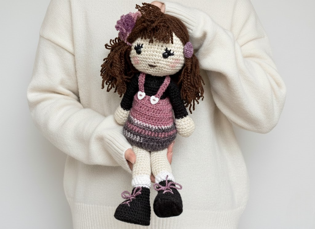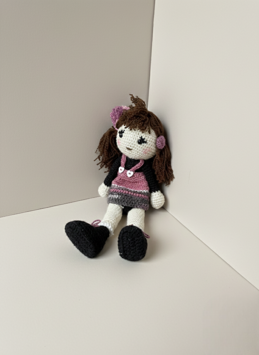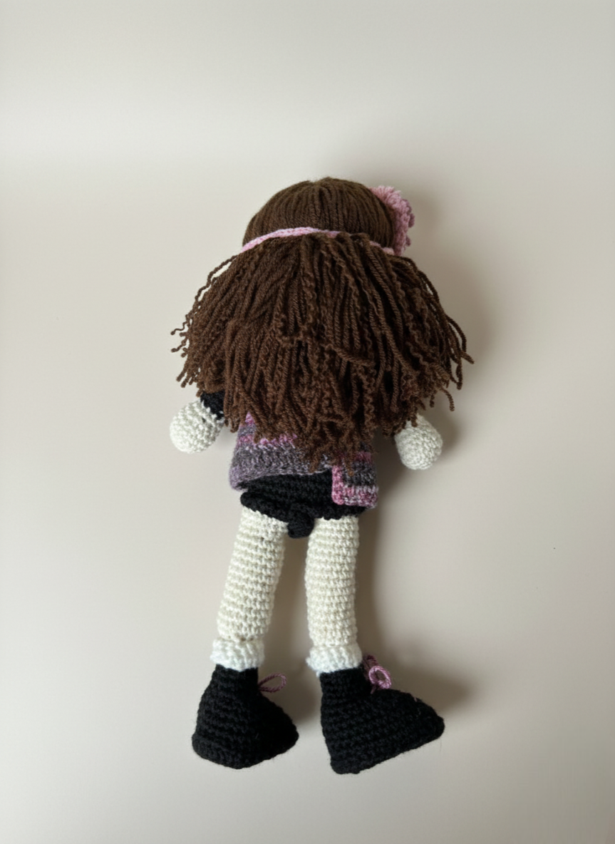 Cette ravissante poupée au crochet porte une jolie tenue dans les tons prune, rose et gris, avec de petits détails adorables comme ses chaussures lacées et sa barrette fleurie. Sa chevelure brune, douce et bouclée, lui donne une personnalité pleine de charme. Entièrement faite à la main, elle est agréable à tenir, douce au toucher et parfaite pour accompagner un enfant dans ses jeux ou pour apporter une touche chaleureuse et décorative dans une chambre.
